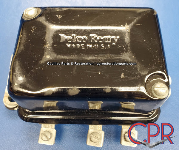 1949 1950 1951 Cadillac Current & Voltage Regulator (40amp, 6V) - NOS. Part# 1118300. Fits: 1949 & 1950, all; 1951 before engine# 68721. Replaces part# 1118357. See photos for dent in one corner.